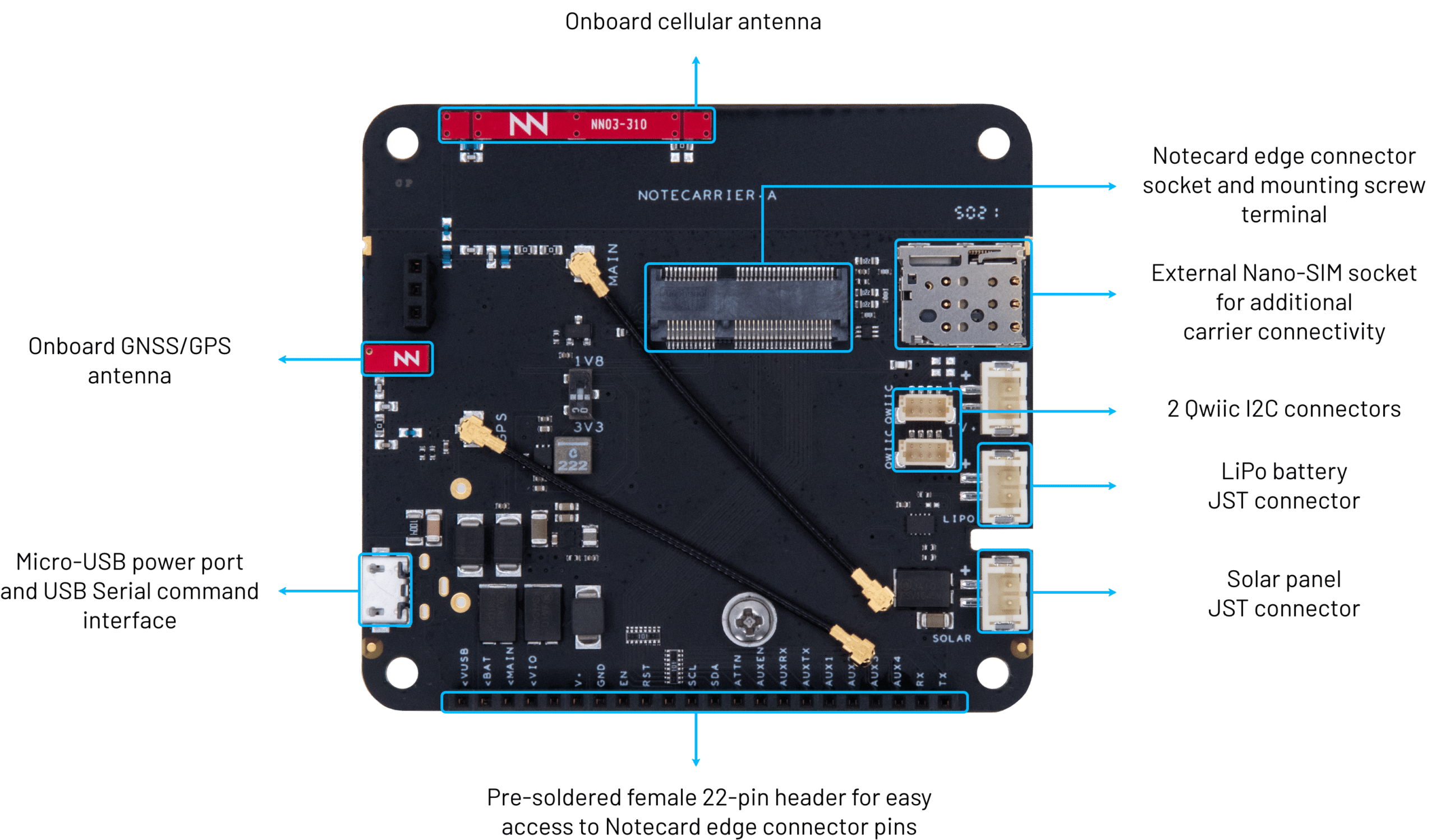 - Notecarrier: A prototyping board with cellular/Wi-Fi and GPS antennae, used to breakout the pins on the Notecard’s M.2 connector.