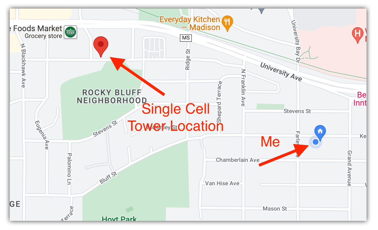 For example, here is the approximate position of the cell tower used in a recent request, relative to my location: