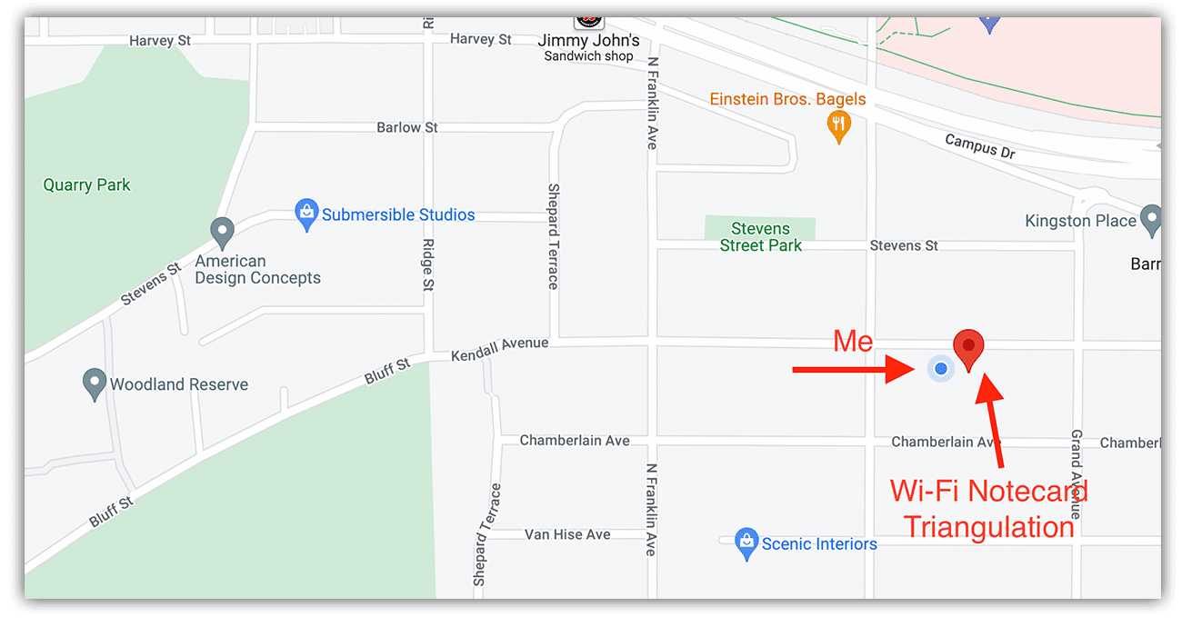 How different are my results when using Wi-Fi triangulation? Well the only access point my ESP32 was able to find was my own router. However, even with just that one AP, here are the results: