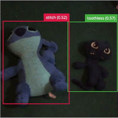 In my case, my model seemed to struggle on images where my stuffed animals sat at odd angles. For example, see below where the model thought an upside down Stitch was actually a Toothless. So if I want to improve my model, I likely need to provide more labeled images with my stuffed animals at a variety of angles.