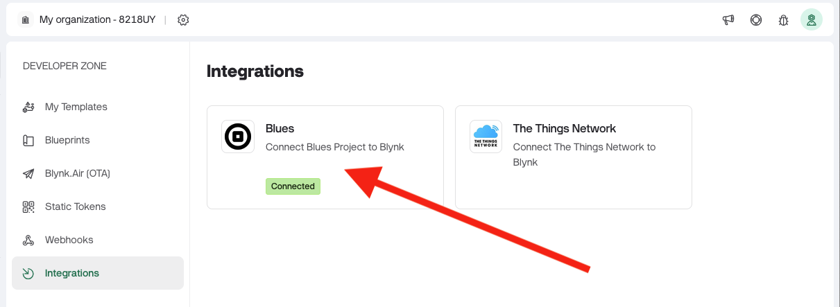 New today in Blynk’s Console is a Blues integration that allows you to easily connect to your existing Notehub projects.